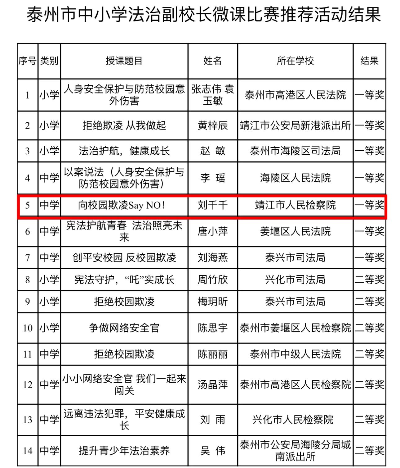 靖江市检察院报送的《向校园欺凌Say NO!》普法微视频荣获泰州市中小学法治副校长微课比赛中学组一等奖!