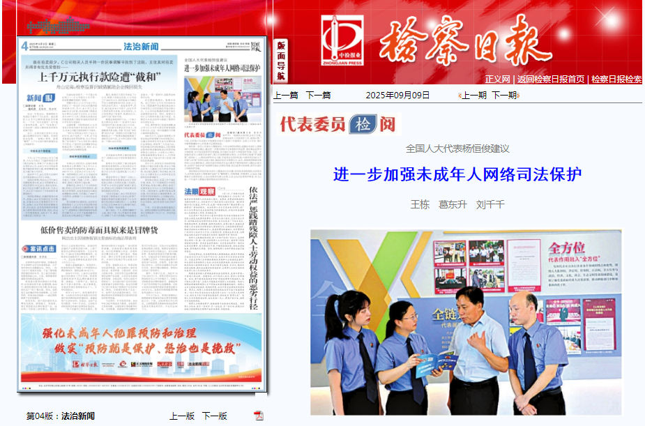 9月9日,《检察日报》报道全国人大代表杨恒俊的法治建议。