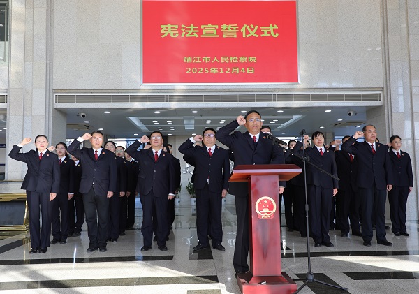 12月4日上午,靖江市检察院开展宪法宣誓仪式,全体宣誓人员列队肃立。奏唱《中华人民共和国国歌》后,在党组书记、检察长冒金山带领下,院领导、检察官和检察官助理面向国旗,右手举拳,庄严宣誓。